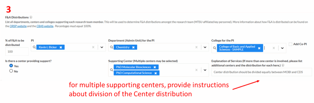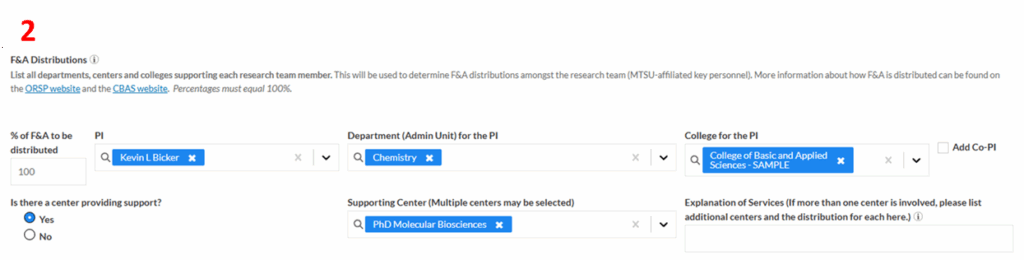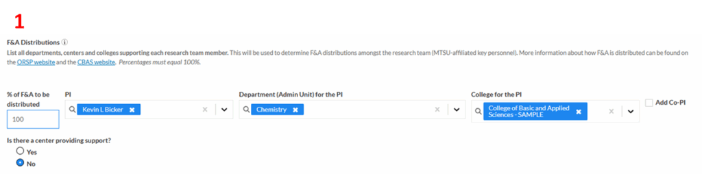 For proposals that do not involve multiple PIs, indicate a 100% distribution to the PI and list the PI’s name along with the supporting Department and College. If the PI or proposal is not supported by a Center in one of the ways described above, then in response to the question “Is there a center providing support?” check the box “no”.