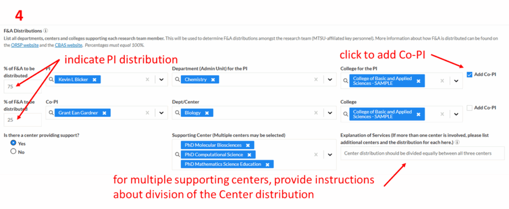 For multi-PI proposals, click the “Add Co-PI” box and add information (supporting Department, College) for the Co-PI. Adjust the “% to be distributed” to reflect the amount of effort each PI is contributing to the project.